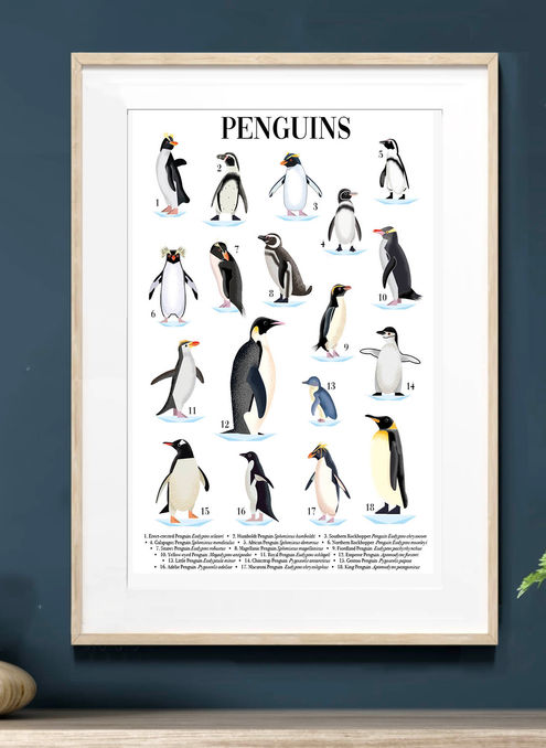 A wonderful way to learn about the all the penguins of the world. These prints feature each penguin species and illustrates their unique qualities in a stylised way. Each penguin is listed with their familiar name and their latin name making the poster a great classification chart. Ideal for anyone who loves penguins and the natural world as much as I do.